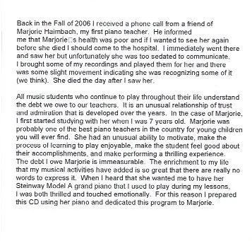 Categories: All Performance Consultation All | Performance | Consultation | Wedding Music Selections (mp3 files) $10.00 Wedding Consultation $0.00 Classical Favorites $300.00 Frank Violin Sonata/Beethoven Spring $600.00 Piano Times Two! $300.00 Concert Consultation $0.00 Wedding Service $300.00 Marjorie's Piano MP3 Files $5.00 Beethoven Bookends MP3 Downloads $5.00 Classical Favorites $300.00 Frank Violin Sonata Concert $600.00 Piano Times Two! Concert $300.00 Beethoven Bookends CD $10.00 Sold out Marjorie's Piano CD $10.00 CONTACT Name * First Name Last Name Email * Subject * Message * Thank you!